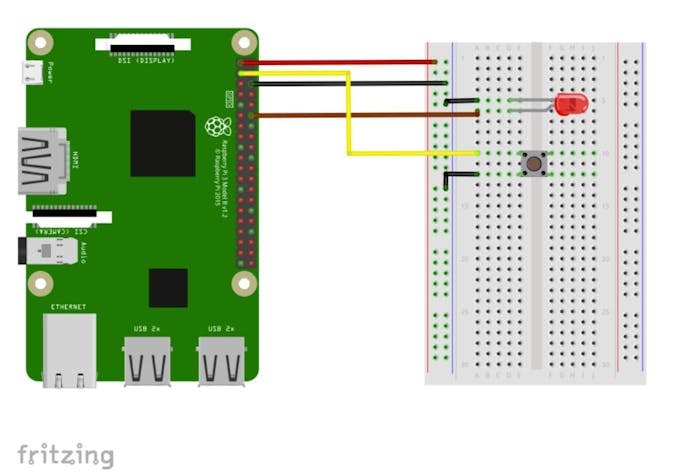 from gpiozero import LED, Button from signal import pause led = LED(18) button = Button(2) button.when_pressed = led.on button.when_released = led.off pause()