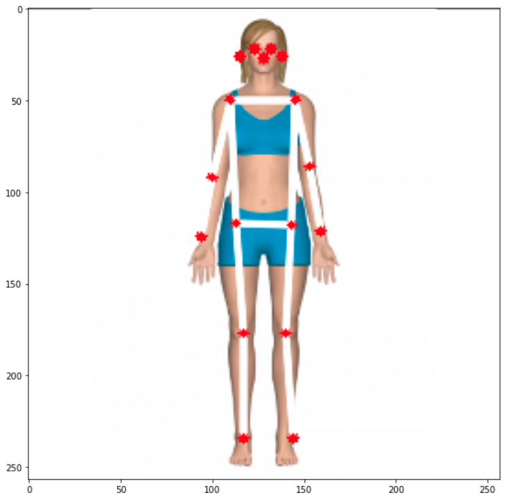 Great, now it is time to create a general function to draw “the bones”, which is the joints’ connection. The bones will be drawn as lines, which are the connections among keypoints 5 to 16, as shown in the above figure. Independent circles will be used for keypoints 0 to 4, related to head:
