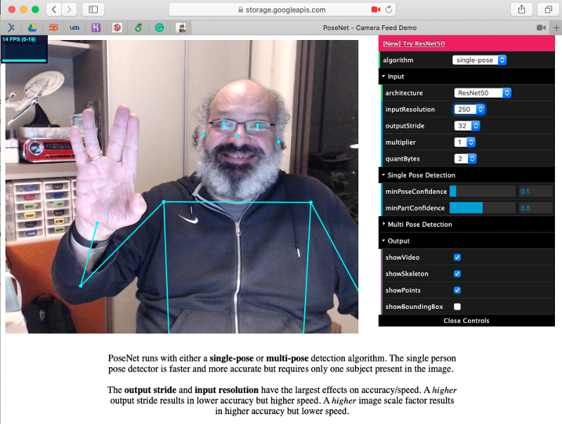 In this site is possible to explore in real time and using a live camera, several PoseNet models and configurations.