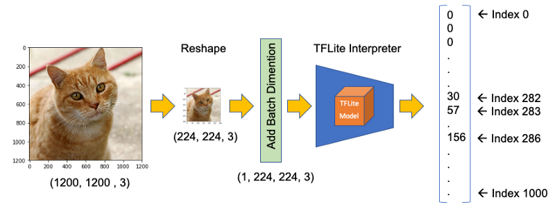 For example, suppose that we want to classify an image wich shape is (1220, 1200, 3). First, we will need to reshape it to (224, 224, 3) and add a batch dimension of 1, as defined on input details: (1, 224, 224, 3). The inference result will be an array with 1001 size, as shown below: