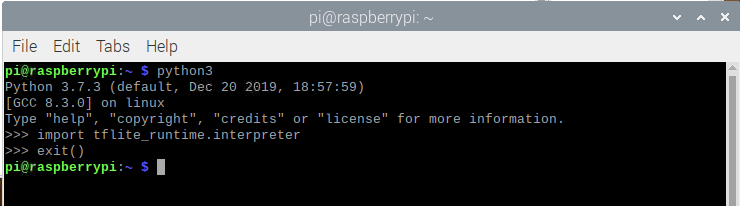 Installing the Python wheel is the only requirement for having TFLite interpreter working in a Raspberry Pi. It is possible to double-check if the installation is OK, calling the TFLite interpreter at the terminal, as below. If no errors appear, we are good.