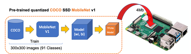 This project, almost eight years after Alex Krizhevsk, a more modern architecture (MobileNet), was also pre-trained over millions of images, using the same dataset ImageNet, resulting in 1,000 different classes. This pre-trained and quantized model was so, converted in a .tflite and used here.