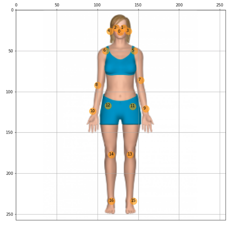 The resultant array shows all 17 coordinates (y, x) regarding where the joints are located on an image of 257 x 257 pixels. Using the code below. It is possible to plot each one of the joints over the resized image. For reference, the array index is annotated, so it is easy to identify each joint: