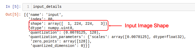The shape of (1, 224x224x3), informs that an image with dimensions: (224x224x3) should be input one by one (Batch Dimension: 1). The dtype uint8, tells that the values are 8bits integers